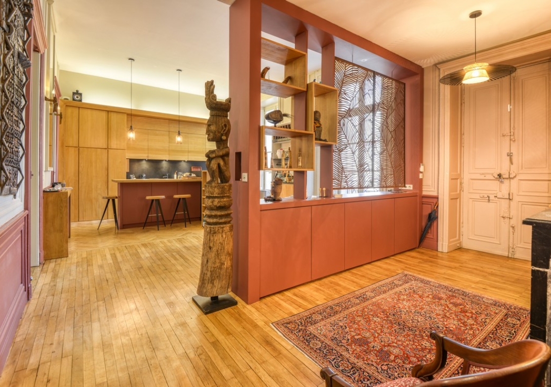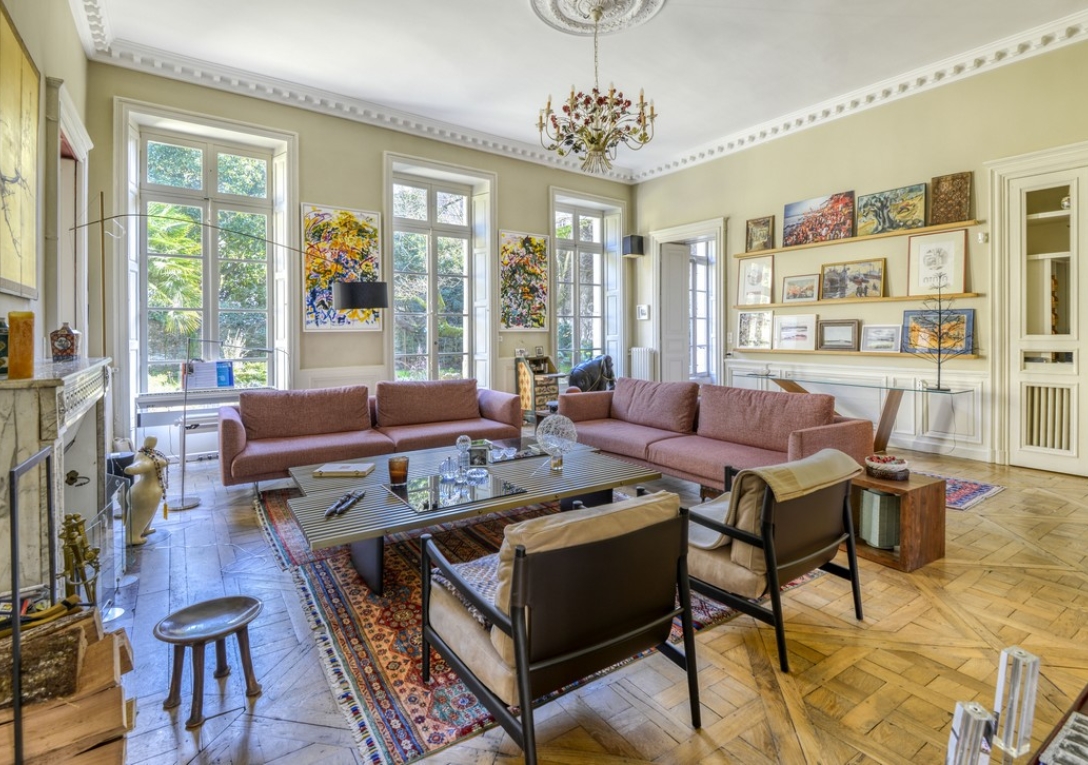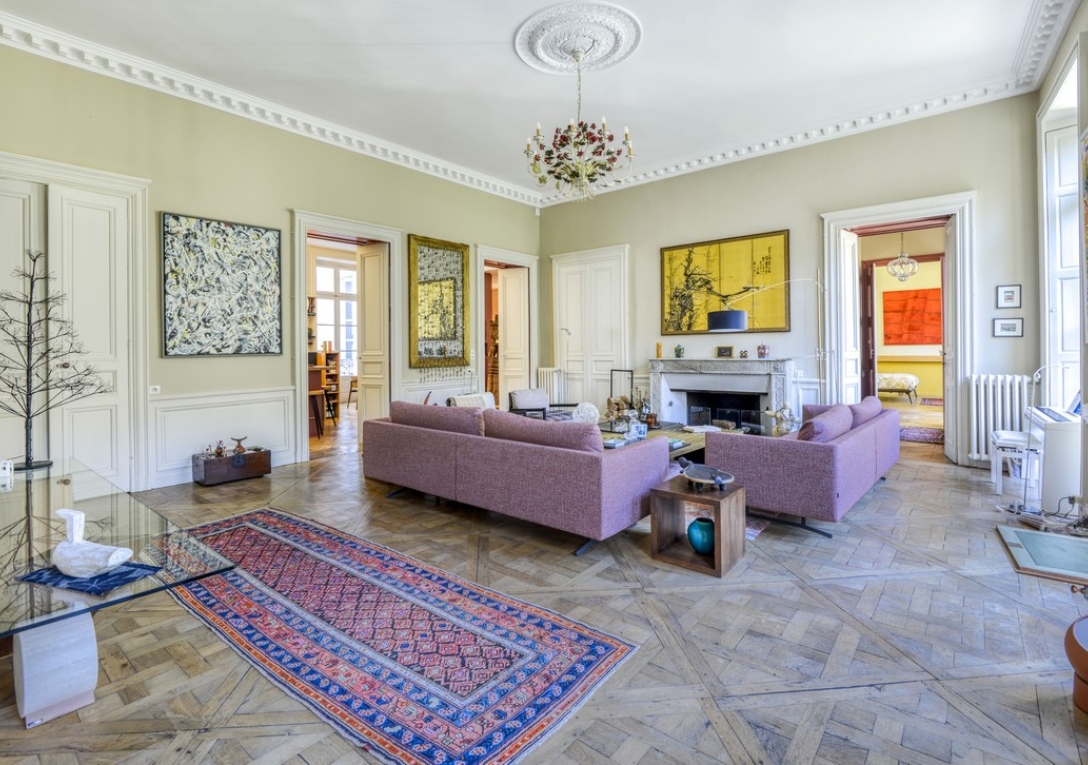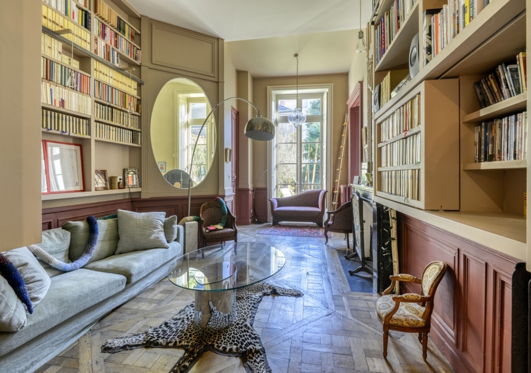 L'appartement propose de belles pièces de réception en enfilade ouvertes sur la terrasse et le jardin. Il comprend un grand salon avec cheminée et parquet Versailles, un salon bibliothèque avec cheminée et une cuisine aménagée et équipée avec espace salle à manger de 32 m².