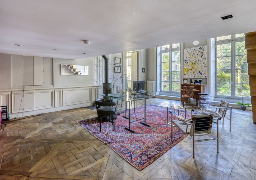 Ce bien immobilier de prestige à Nantes est complété par un garage, une grande cave et un caveau, des prestations particulièrement recherchées en centre-ville. Les deux entrées indépendantes permettent également un usage mixte habitation ou activité professionnelle.