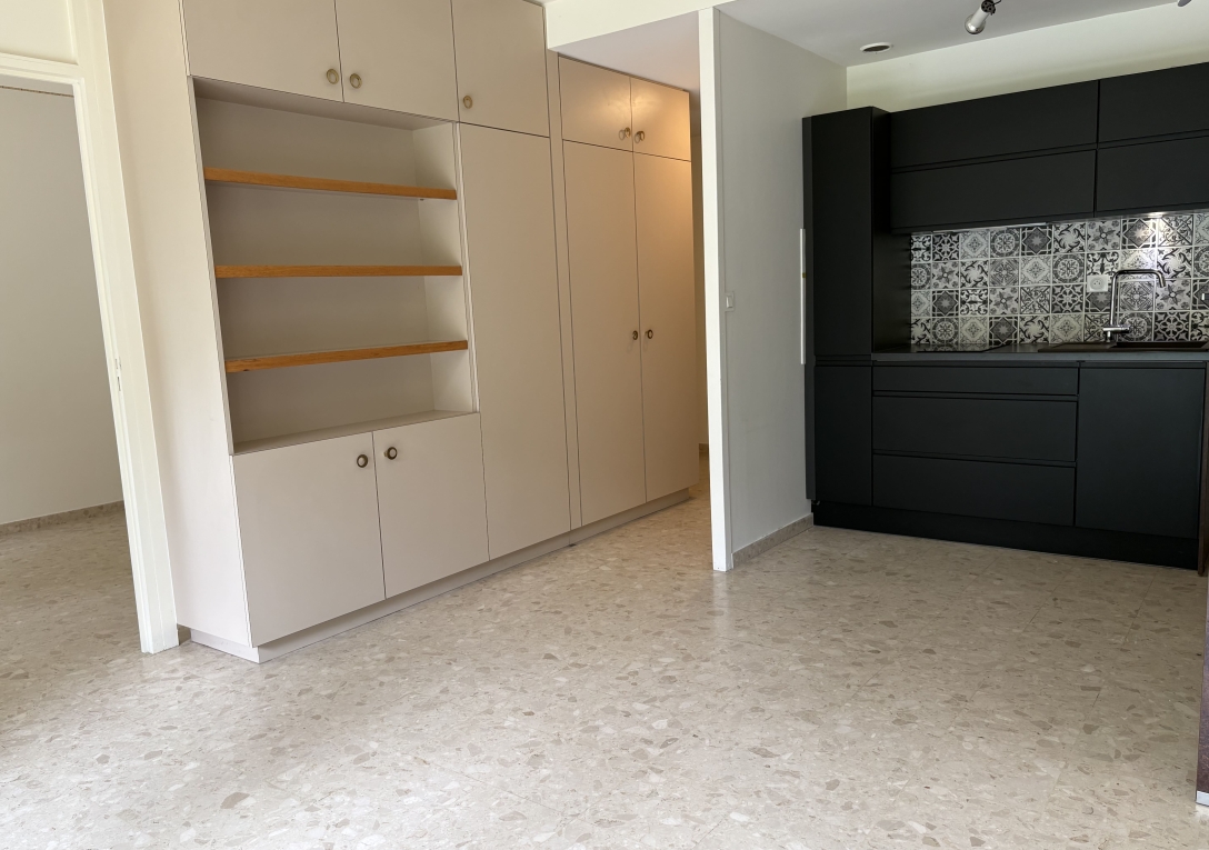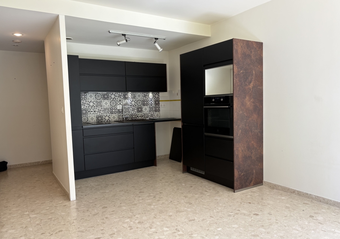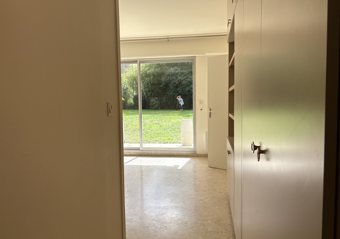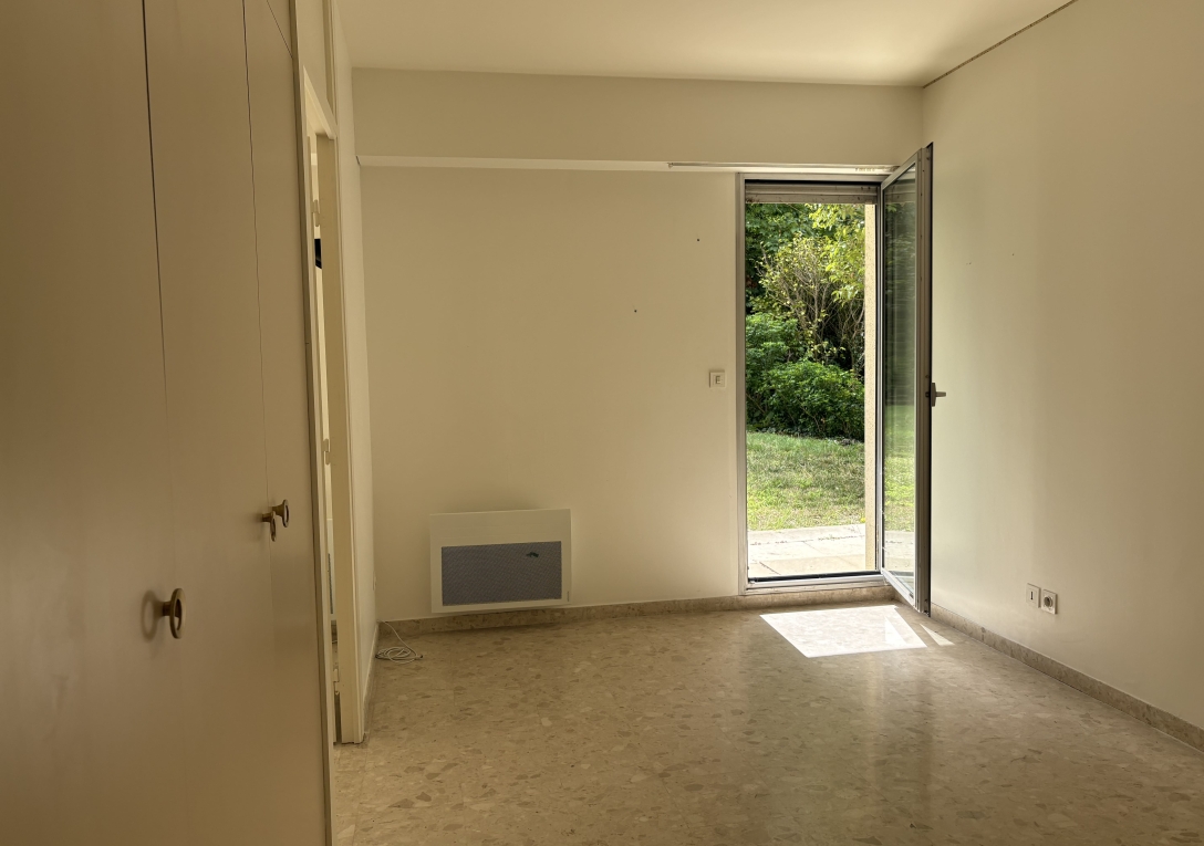 Entrée, séjour avec aménagement étagères et placards sur-mesure donnant sur la terrasse et jardin de la copropriété, cuisine ouverte équipée et aménagée (récente), une chambre avec placards donnant sur terrasse, une salle de bains et WC séparé.