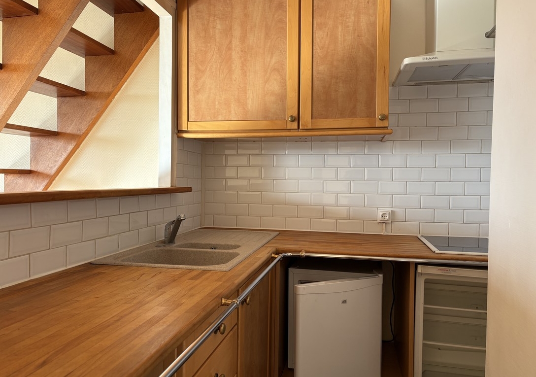 Entrée desservant un séjour de 22 m² donnant sur la terrasse de 15 m² orientée Sud-Ouest, une cuisine aménagée équipée, un wc. A l'étage une chambre avec rangements et une salle de bain attenante.