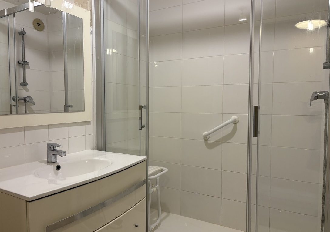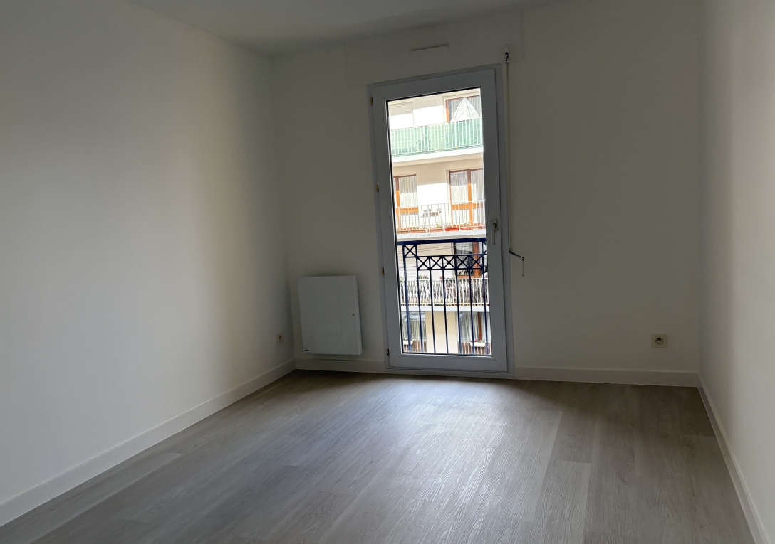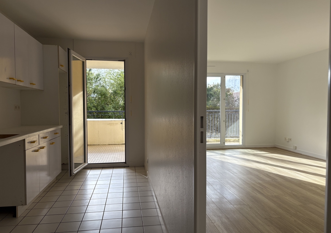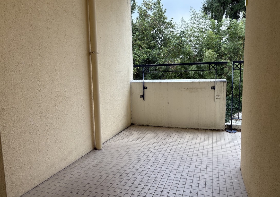 Entrée avec placard desservant un séjour donnant sur un balcon orienté Sud, une cuisine aménagée sur balcon, deux chambres, dont une avec placard, une salle de douche, un wc séparé.