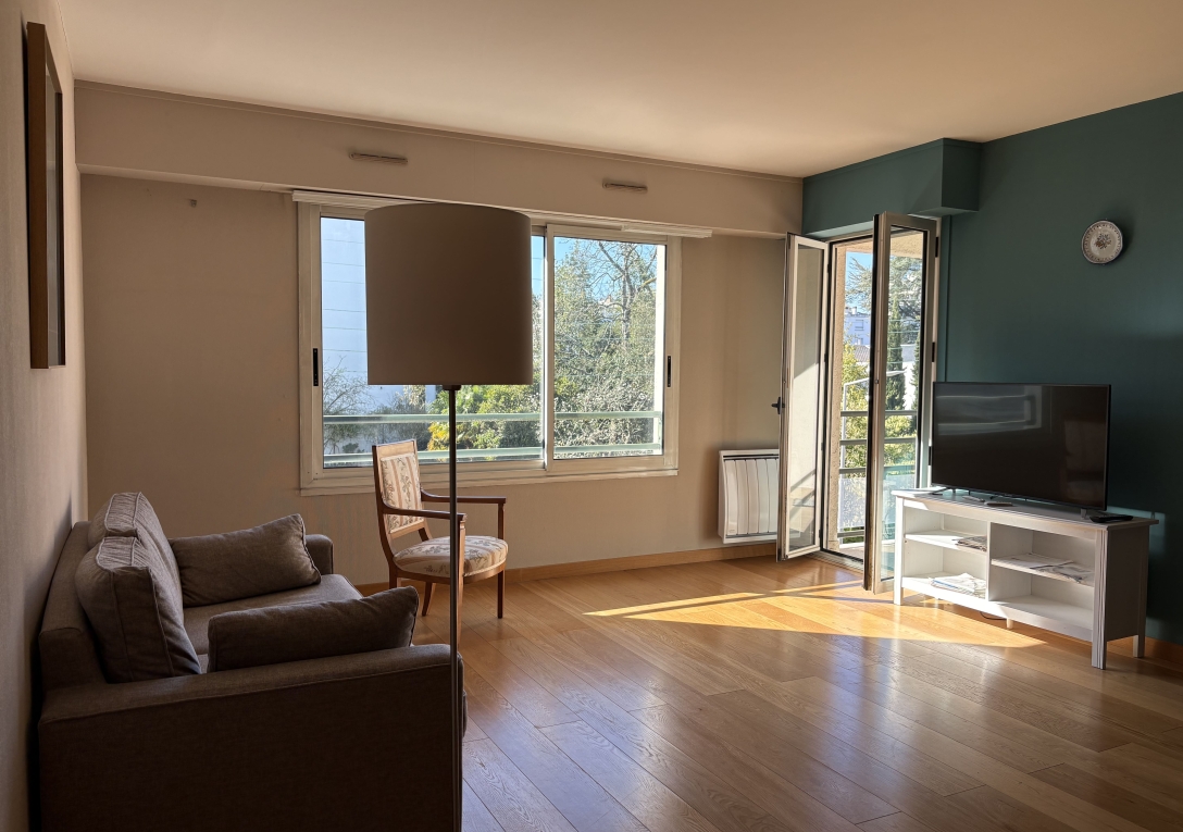 Bénéficiant d'une exposition Ouest, il offre une luminosité agréable tout au long de la journée. L'entrée dessert un vaste séjour de 30 m² avec parquet, chaleureux et lumineux, ouvrant sur la terrasse orientée Ouest. La cuisine, séparée, est aménagée et équipée.