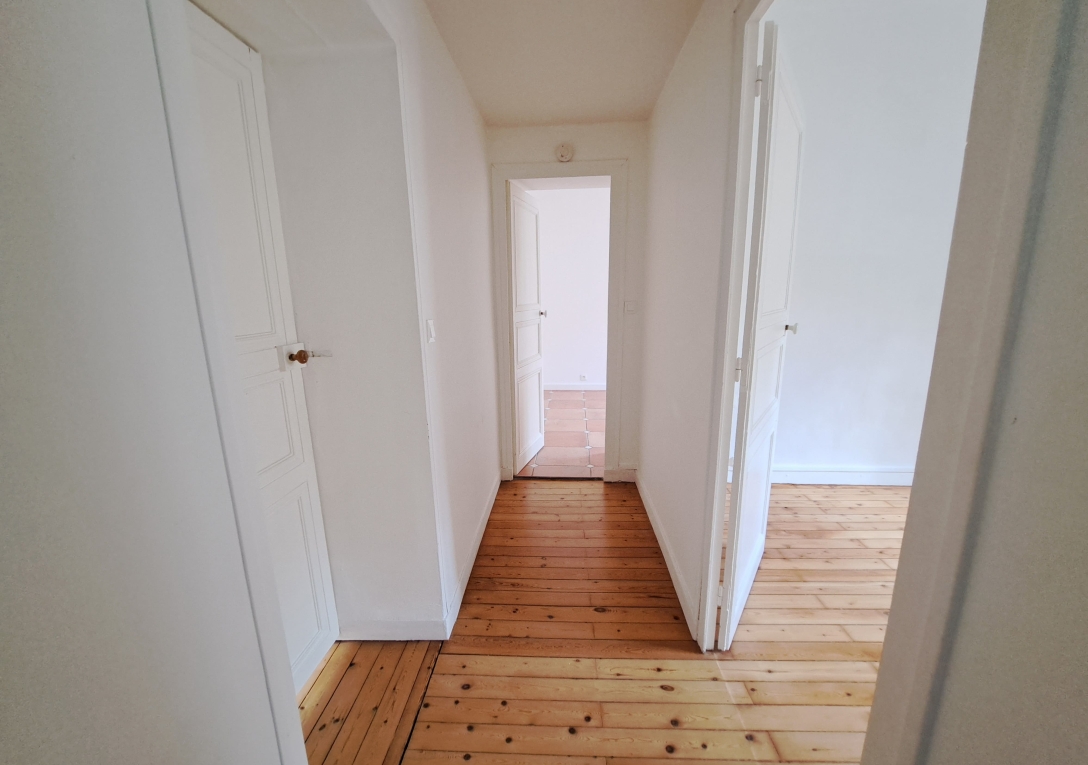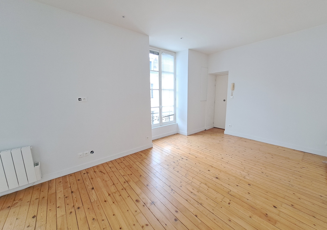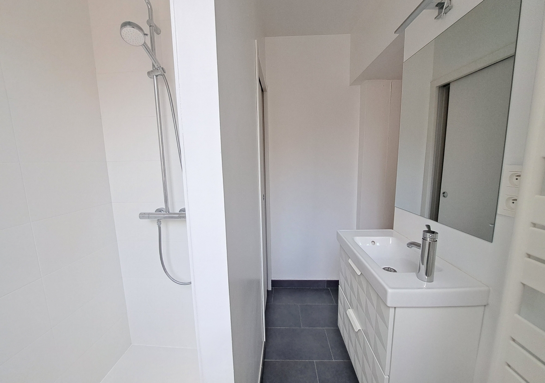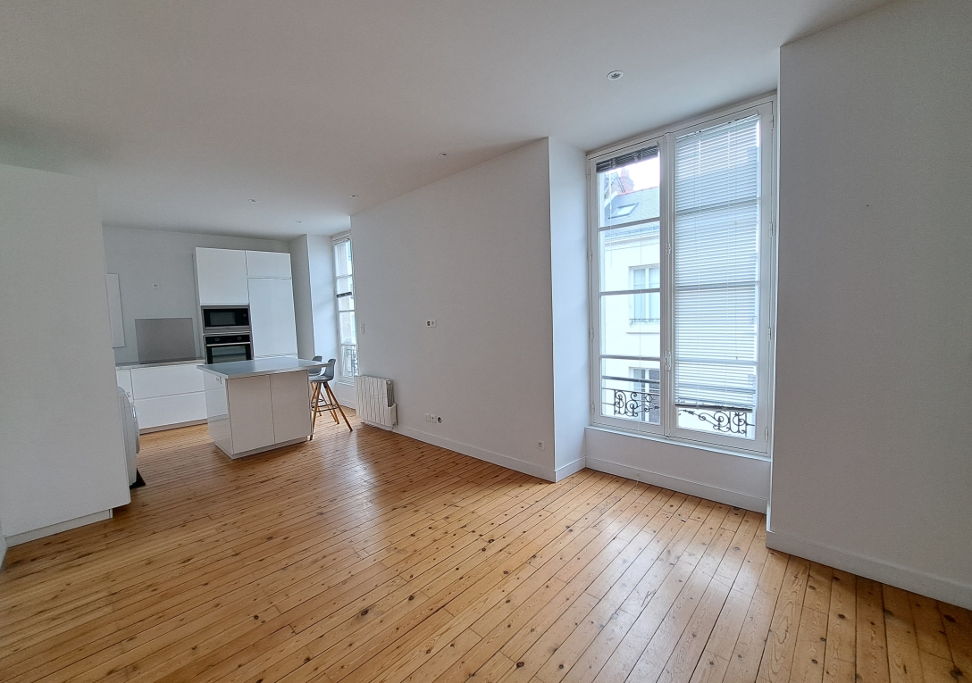 DOBREE / Appartement T3 en 2ème étage (sans ascenseur). Appartement lumineux de 60 m² entièrement rénové avec goût, comprenant un séjour sur parquet avec cuisine aménagée et équipée, 2 chambres dont 1 avec rangements, salle d'eau avec wc.