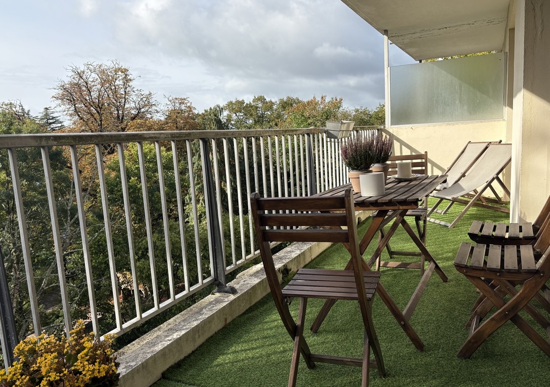 Séjour de 55 m² avec cuisine aménagée équipée donnant sur un balcon-terrasse orienté Sud Ouest, un dégagement avec rangements desservant trois chambres dont une avec point d'eau (possibilité 2e salle de douche) donnant sur un balcon orienté Est, une salle de bain (douche et baignoire), une buanderie, un wc séparé.