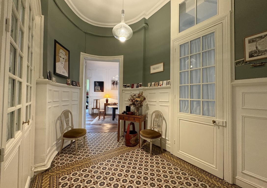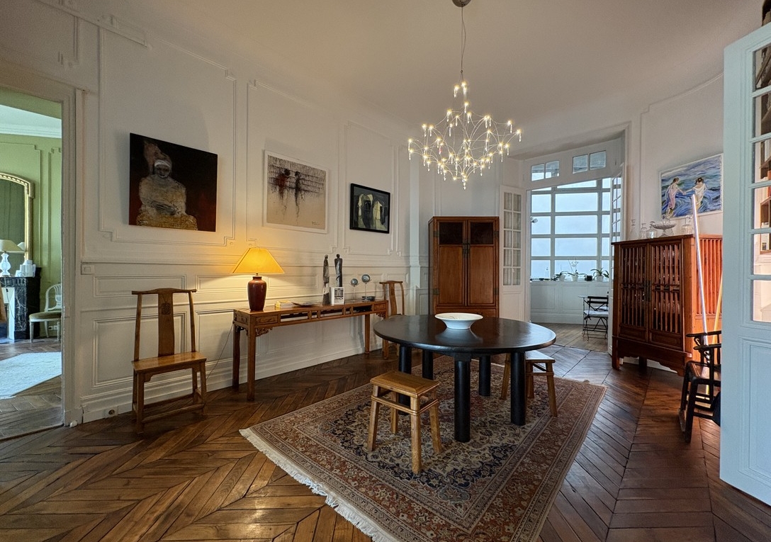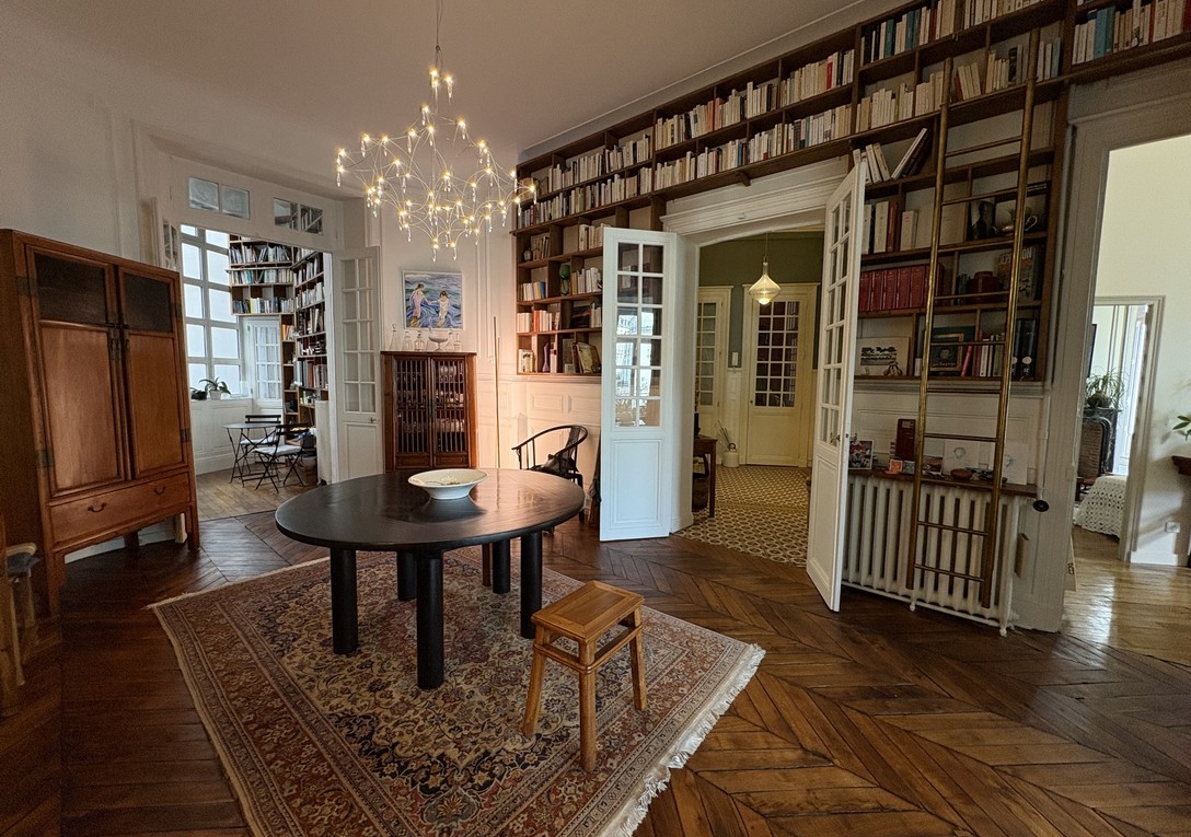 Entrée sur une triple réceptions (parquets Versailles, belles cheminées) donnant sur un balcon filant, cuisine aménagée équipée, trois belles chambres dont une avec salle de douche privative, une salle de douche avec wc, un bureau un dressing, wc. Un grenier et deux caves.