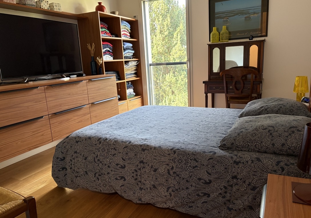 Entrée desservant un séjour de 43 m² donnant sur un balcon orienté Sud, une cuisine aménagée équipée donnant sur un deuxième balcon avec vue dégagée sur la verdure, trois chambres dont une suite avec salle de douche privative, une deuxième salle de douche avec wc, un wc séparé/buanderie.
