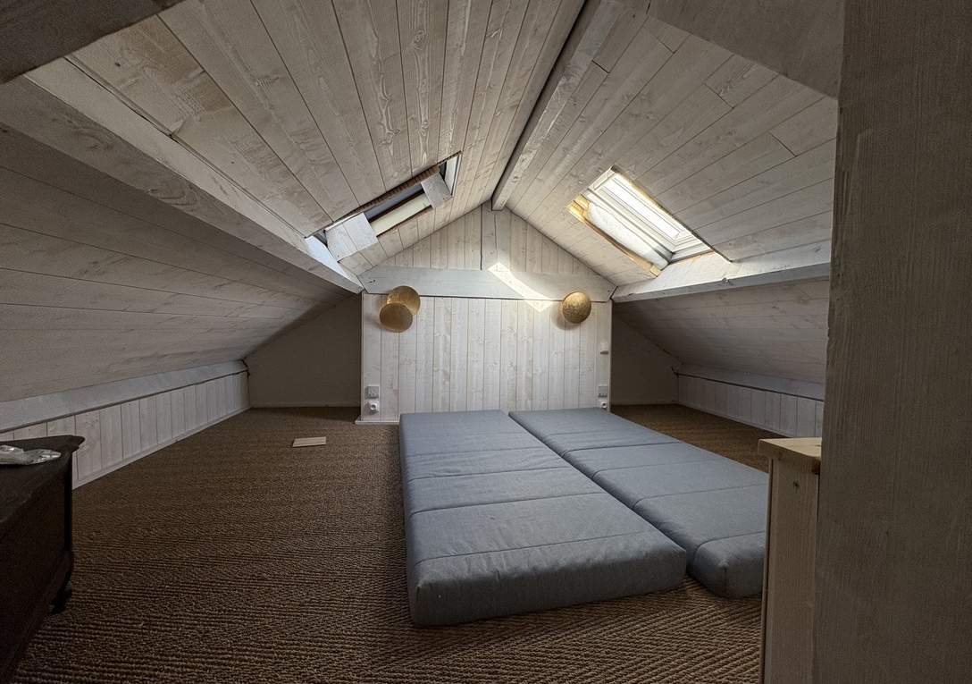 À l'étage, un palier dessert trois chambres et une salle de bains avec WC. Les combles ont été aménagés et offrent un couchage d'appoint.