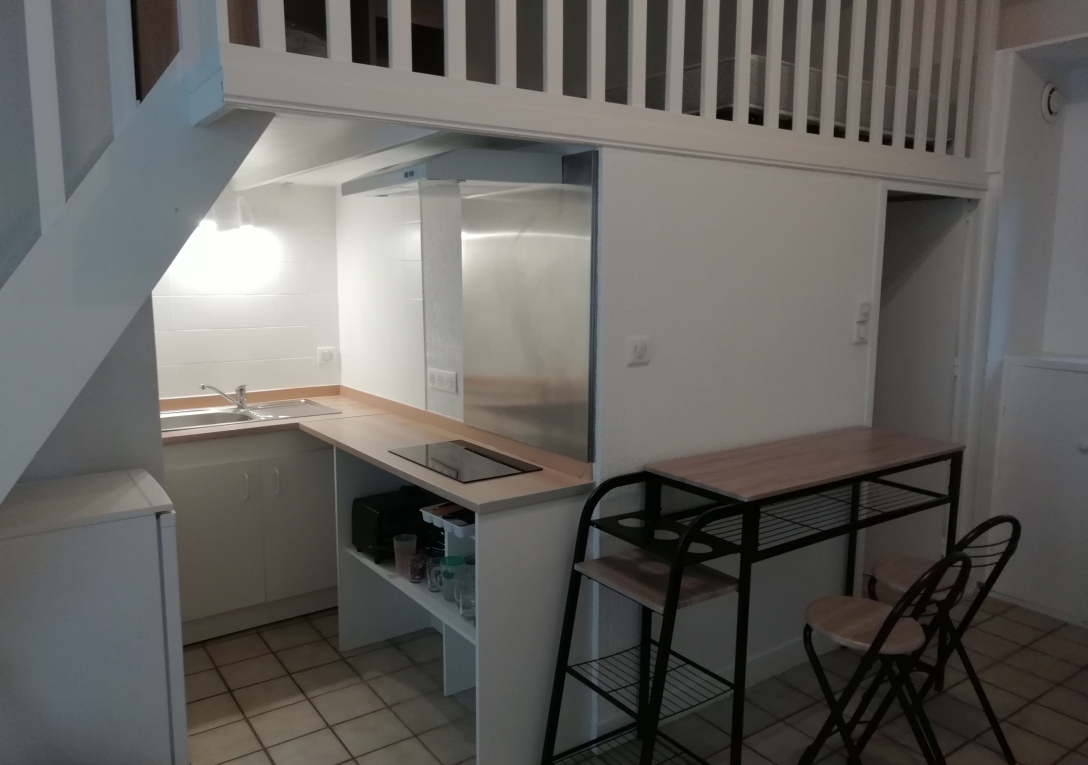 NANTES CENTRE VILLE | Entre Viarme et la Place Aristide Briand, appartement meublé en rez-de-chaussée, comprenant une pièce de vie avec coin cuisine, une mezzanine avec rangements, salle d'eau avec WC.